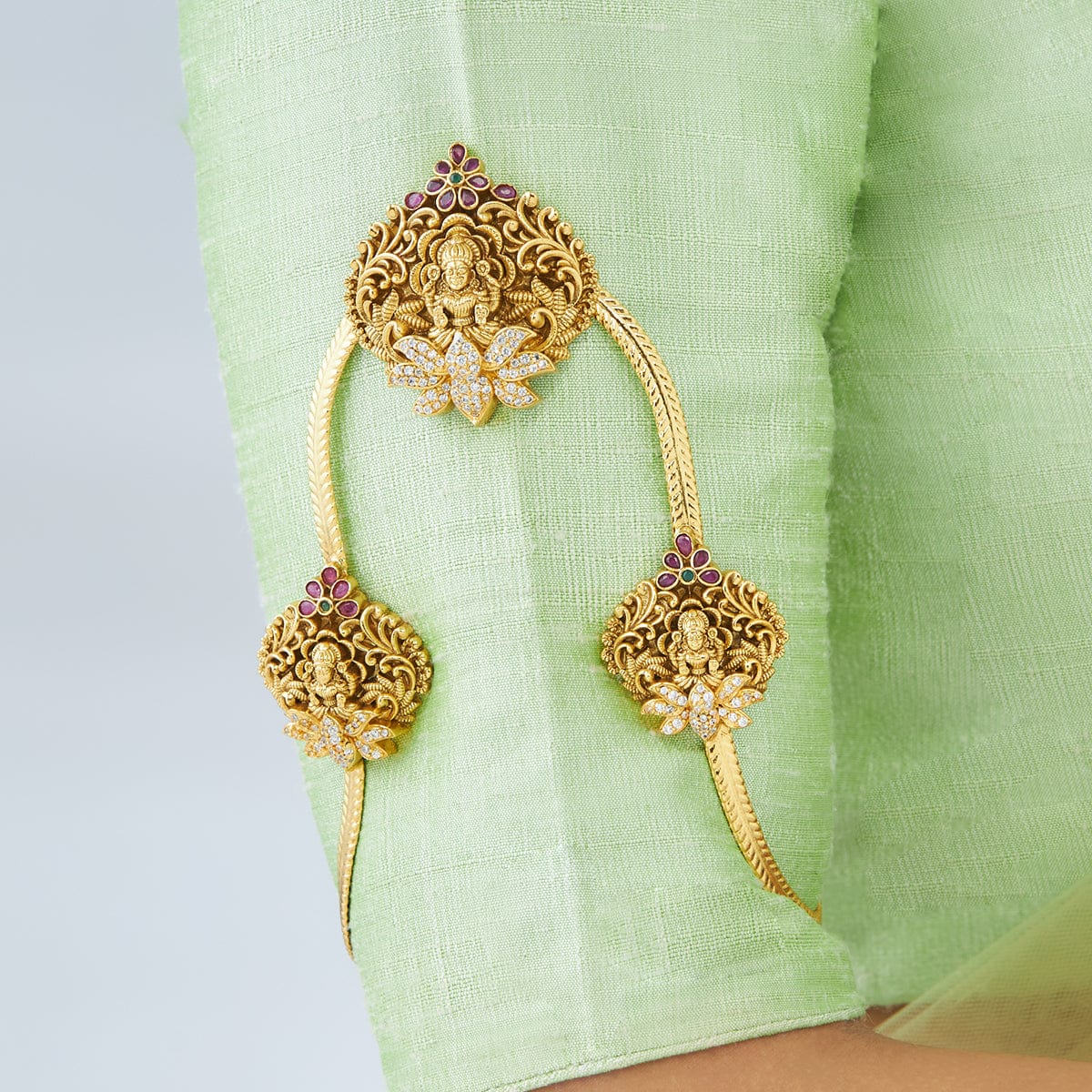 Add a touch of royalty to your traditional outfit with our antique bajuband. It's covered in shiny gold and has Goddess Laxmi on a lotus flower. The lovely flower designs and red synthetic stones make it special. You won't need to spend too much on this unique, beautiful piece that goes well with your ethnic clothes.