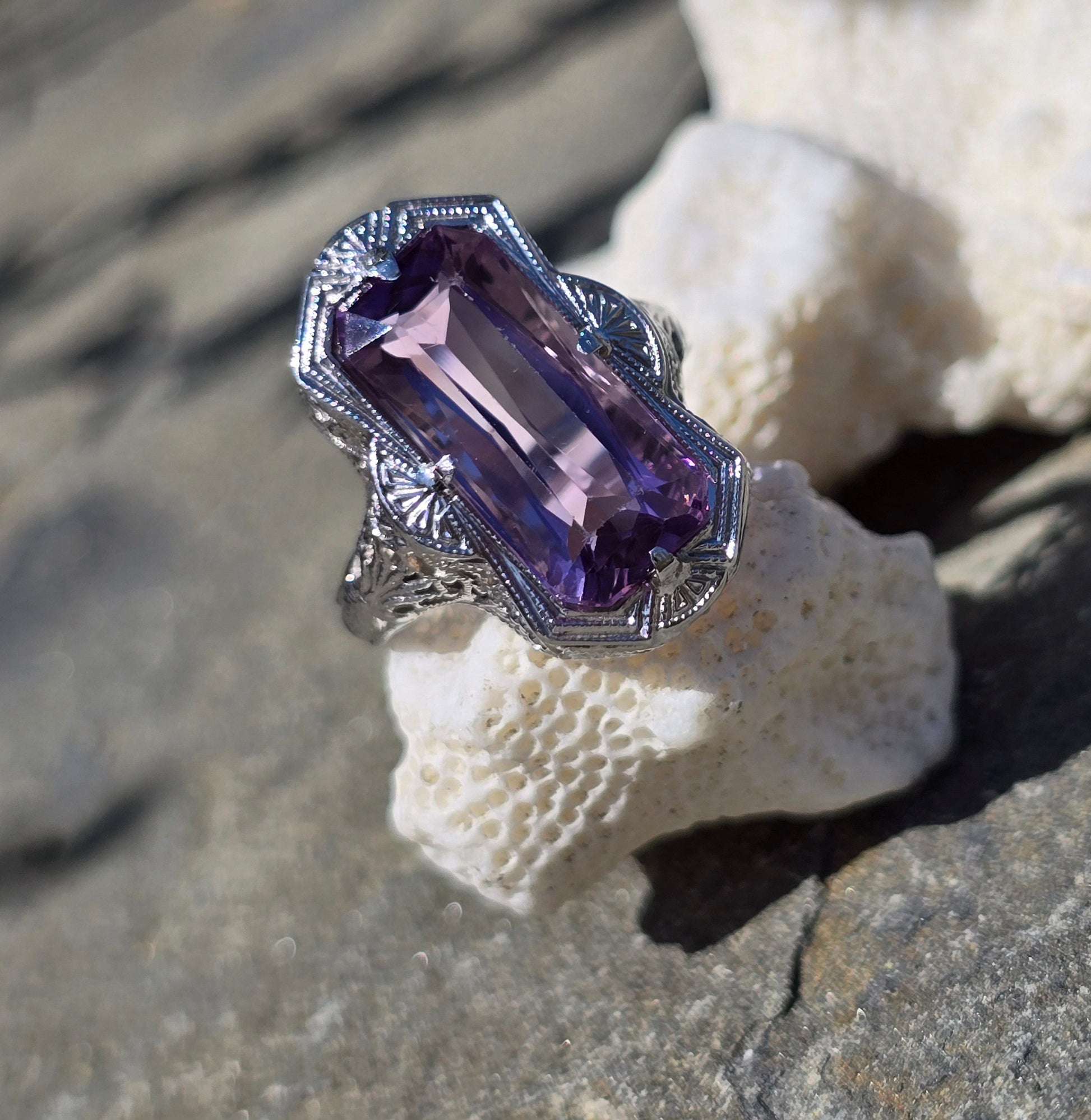 14k white gold filigree emerald cut amethyst c.1920's antique ring
