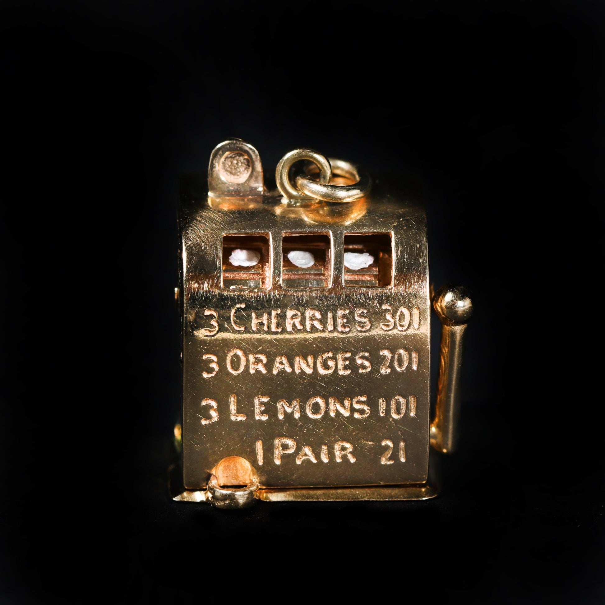 14k yellow gold charm. Pull the handle and test your luck with this charming slot machine charm! The charm is a true collectors item, evoking memories of the classic slot machines found in old-fashioned casinos and gaming halls. Featuring expertly detailed engraving, it captures the intricacies and design elements of a vintage one-armed bandit. From the colorful reels and buttons to the detailed lever, this charm is a miniature work of art sure to be a conversation starter!