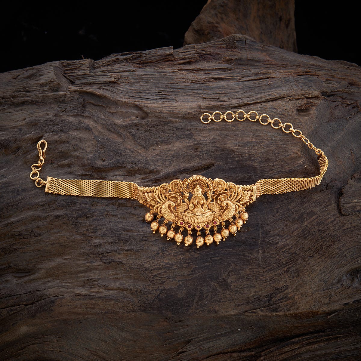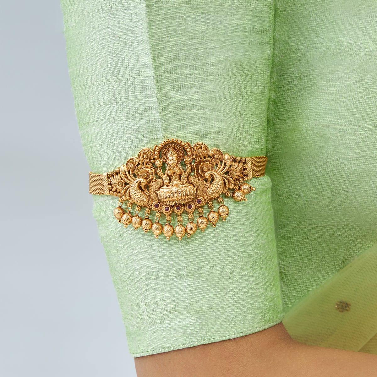 Our gorgeous Antique Bajuband will give your outfit a boost! With antique ruby stones sparkling on it, it attracts attention and radiates royalty. Accept the blessings of Goddess Laxmi, whose magnificent incarnation is skillfully created onto this bajuband. This lightweight, fashionable item promises to finish your ethnic costume as an elegant accessory.