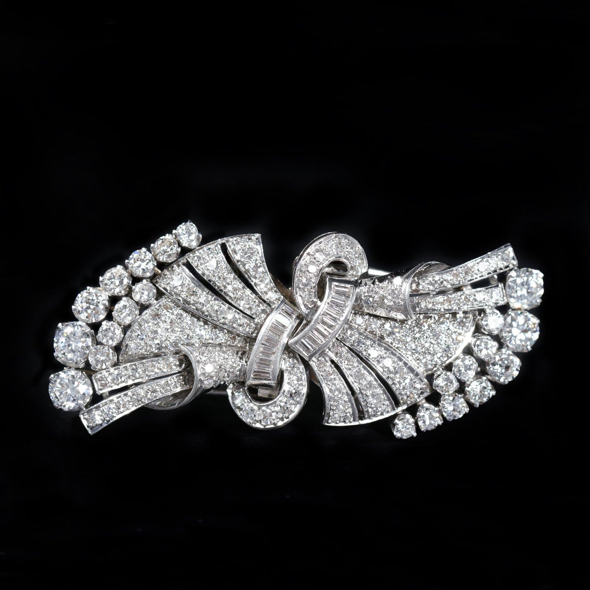 Art Deco platinum and diamond lapel clips/brooch. A striking example of 1930s glamour and craftsmanship, this piece features a fan-like composition that, when worn together as a brooch, takes on the appearance of a stylized bow¨•graceful, balanced, and full of movement. The crisp geometry of the baguettes, the soft brilliance of the transitional cuts, and the shimmering texture of the single cuts all come together in a perfectly balanced, symmetrical design. Versatile and richly detailed, these clips can be worn as a brooch or separated for styling on lapels, collars, or even as hair ornaments¨•making them a true celebration of Art Deco style and ingenuity.