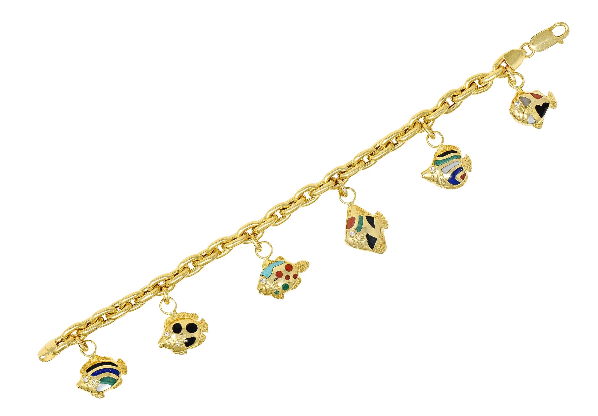 Asch Grossbardt Diamond Inlaid Multi-Gem 18K Yellow Gold Fish Vintage Charm Bracelet