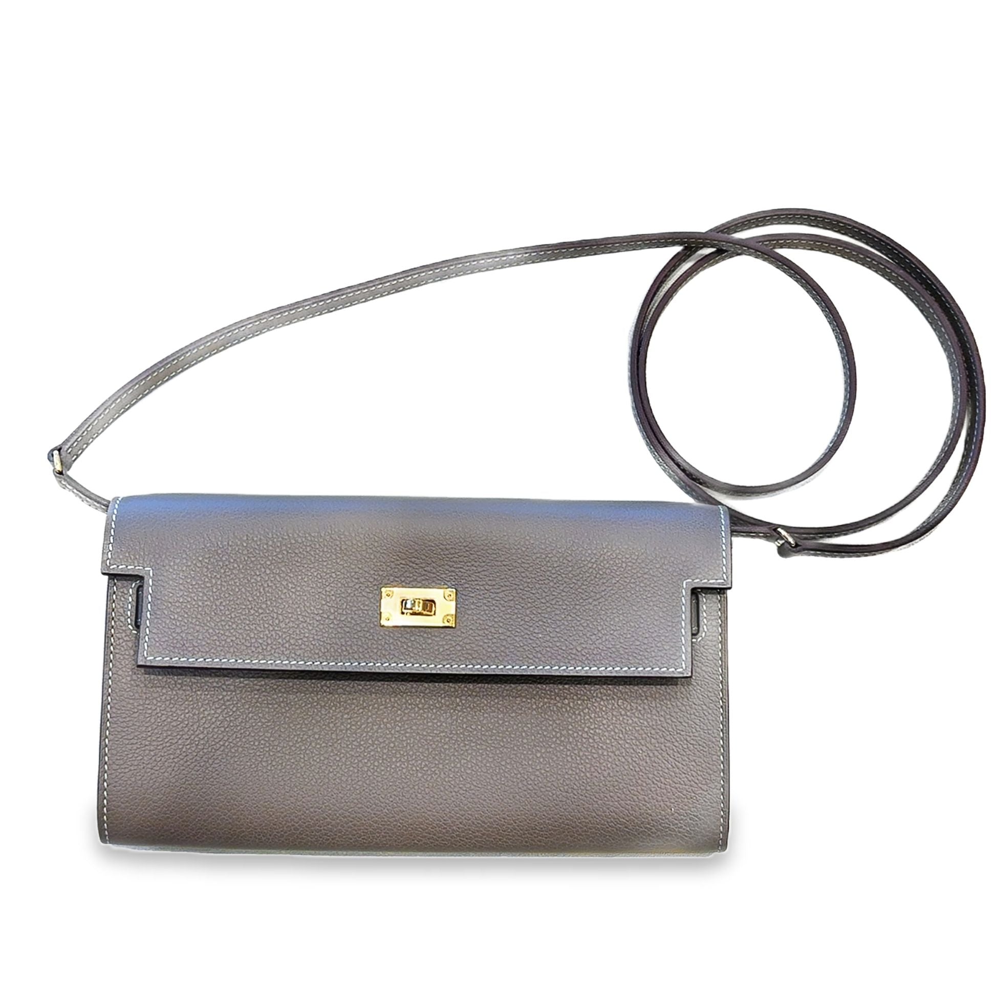 A Kelly Wallet To Go is in Etoupe epsom leather with gold hardware and has contrast stitching, two straps with front toggle closure and removable crossbody strap.