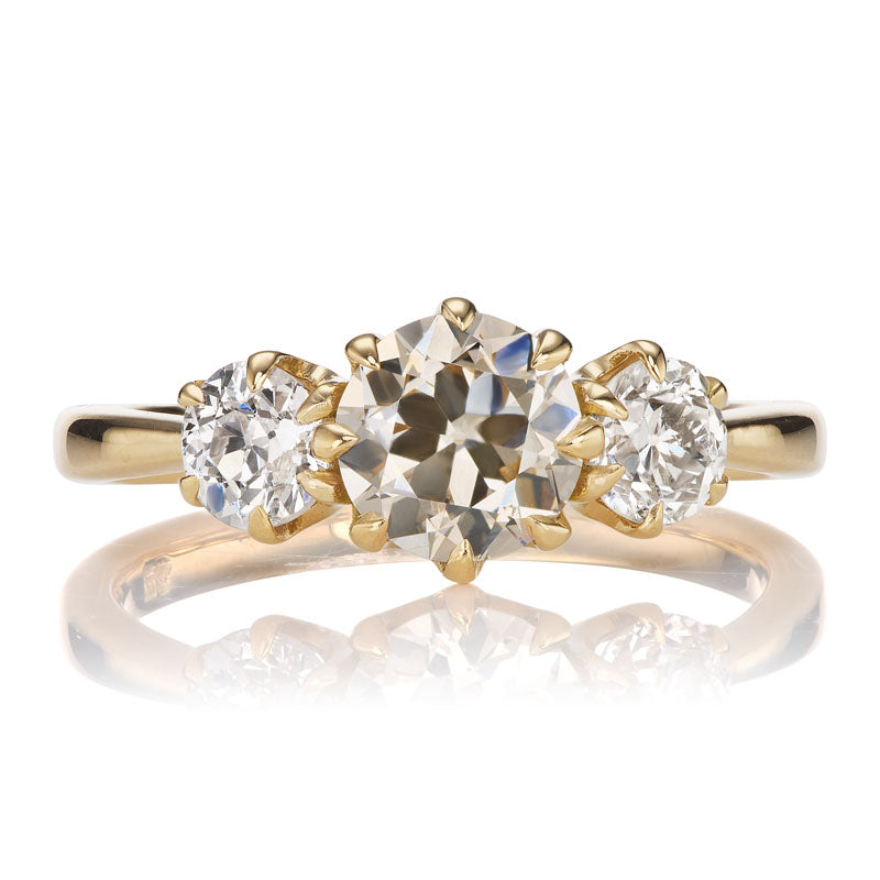 The Marielle 0.92 ring is an AB original design. The ring centers a GIA-certified 0.92 carat Old European Cut diamond of U-V Light Brown color (read: Champagne), VS1 clarity. An additional Old European Cut diamond is set to either side, both combining for 0.61 carats of approximately I-J color, SI clarity. The stones are all set in an 18kt gold setting. The ring is currently size 6 and can be resized!