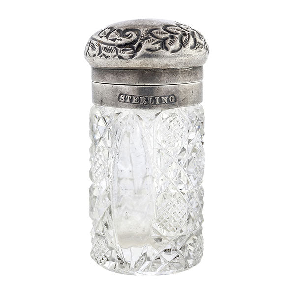 Measuring approx. 1 5/8 inches high, with an ornate repousse silver top on a cut glass bottle with glass stopper.